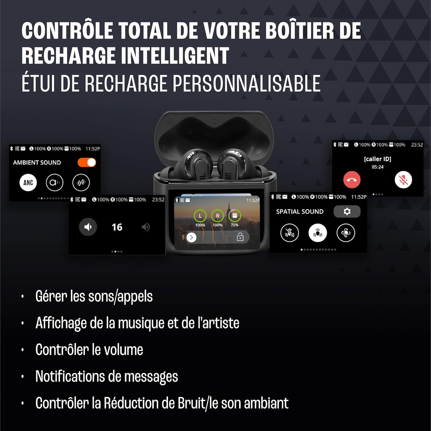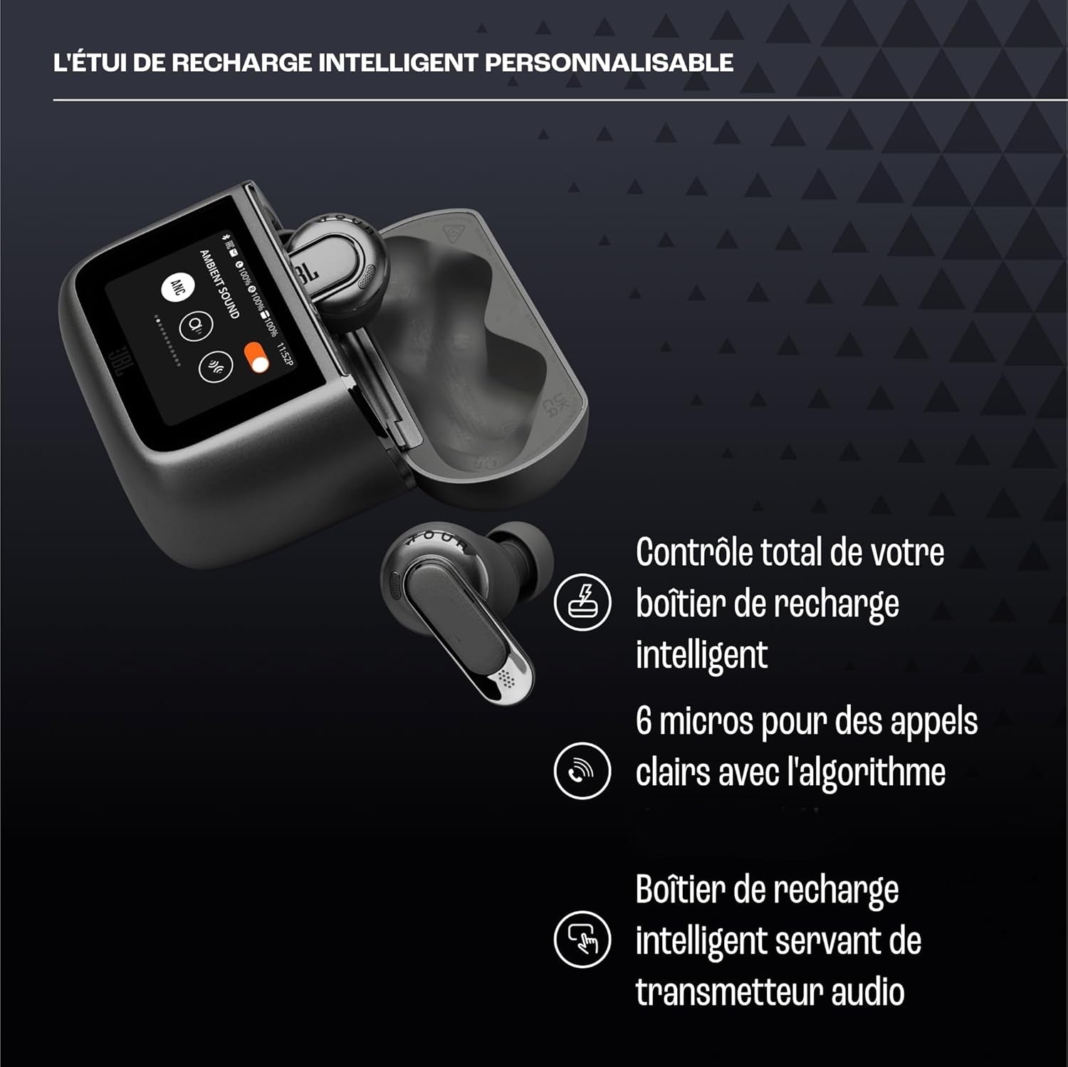 Écouteurs sans fil à réduction de bruit avec boîtier de charge intelligent